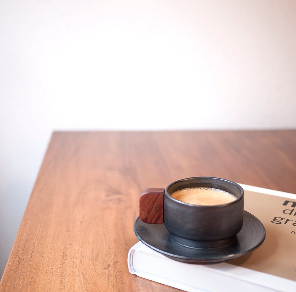 Ceràmica de porcellana esmaltada realitzada artesanalment, evitant components tòxics com el plom i el cinc, procediment que dificulta la cocció però realça la bellesa natural de la ceràmica, creant patines sedoses al tacte i convertint cada tassa en una peça única.